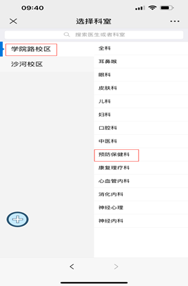 2)选择学院路校区→预防保健科→成人接种或儿童接种→进行挂号