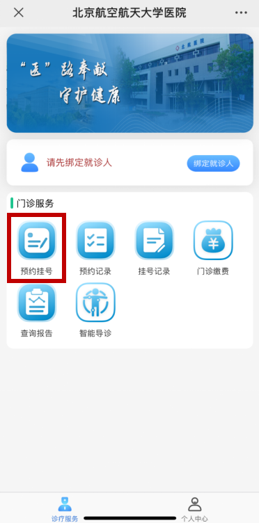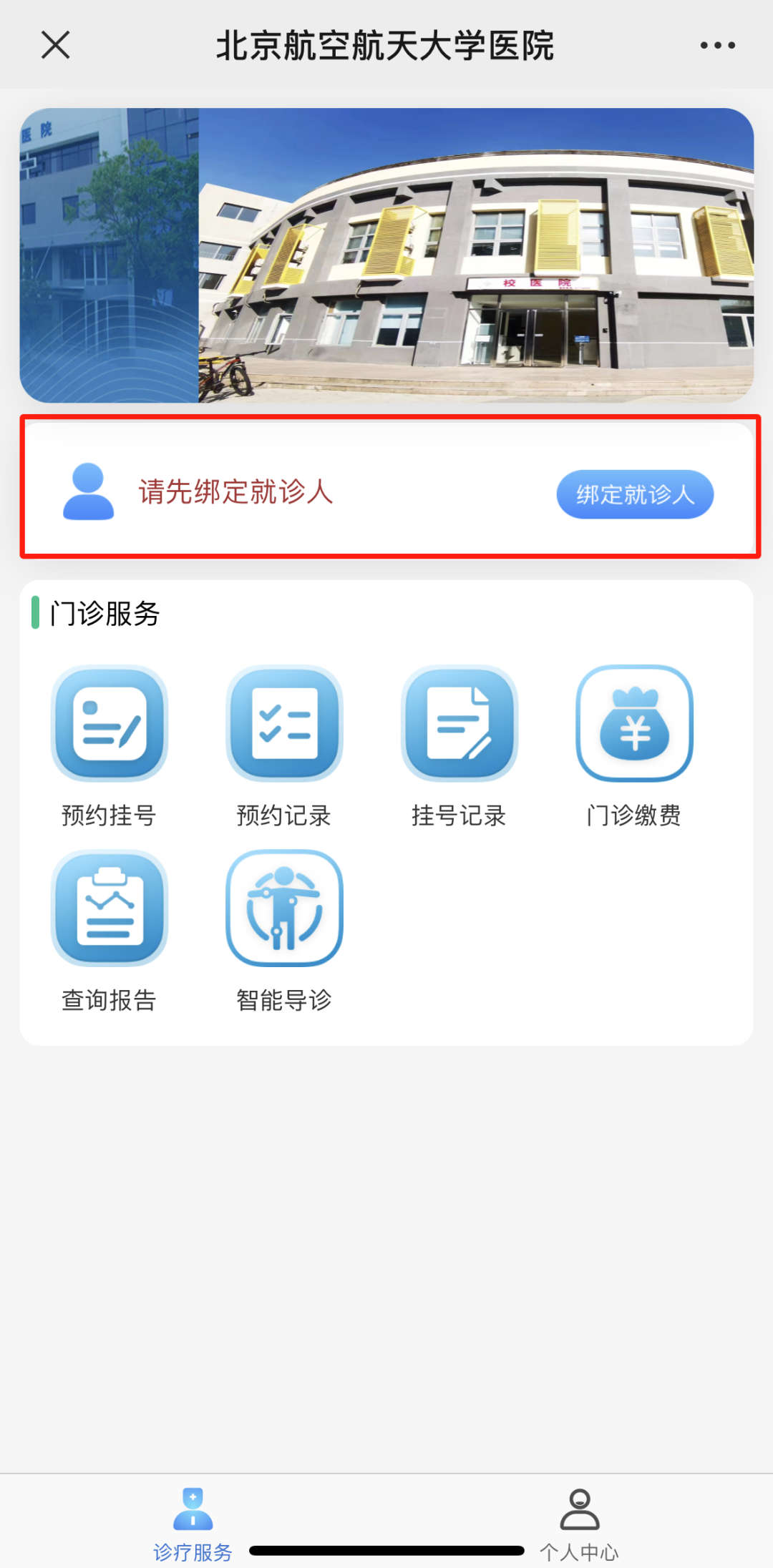 1)点击系统上方“绑定就诊人”,输入姓名、证件号码、手机号后查询就诊卡。北航公疗患者、在校医院就诊过的自费及医保患者可以绑定就诊卡。